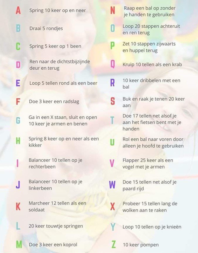 Druk onderstaande afbeelding af. Kies een woord dat past bij de Paasvakantie. Zoek de letters van je gekozen woord en voer de opdrachten bij de verschillende letters uit. De andere moet raden wat jij uitbeeldt. Je kunt er ook voor kiezen om je eigen naam uit te beelden of misschien je lievelingsdier!