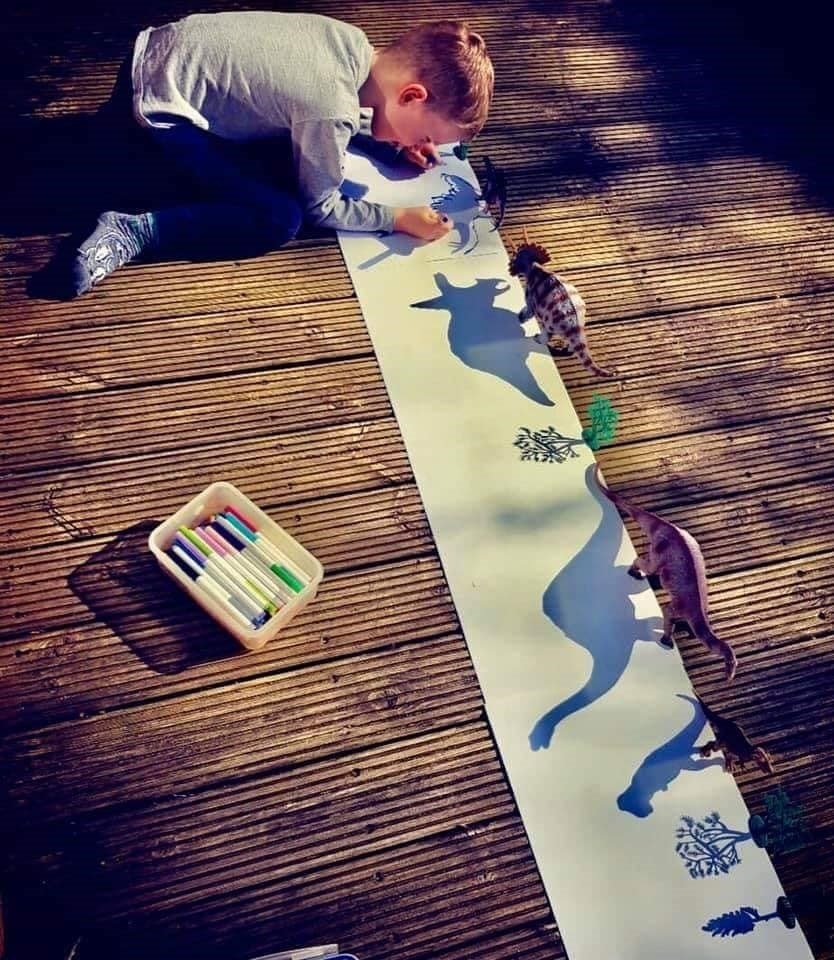 Zoek wat leuk speelgoed en zet dit zo zodat de zon een schaduw maakt op je papier. Je hoeft enkel de randen van de schaduw te volgen. En tadaaaaa…jouw favoriete speelgoed staat op papier!